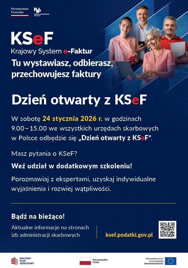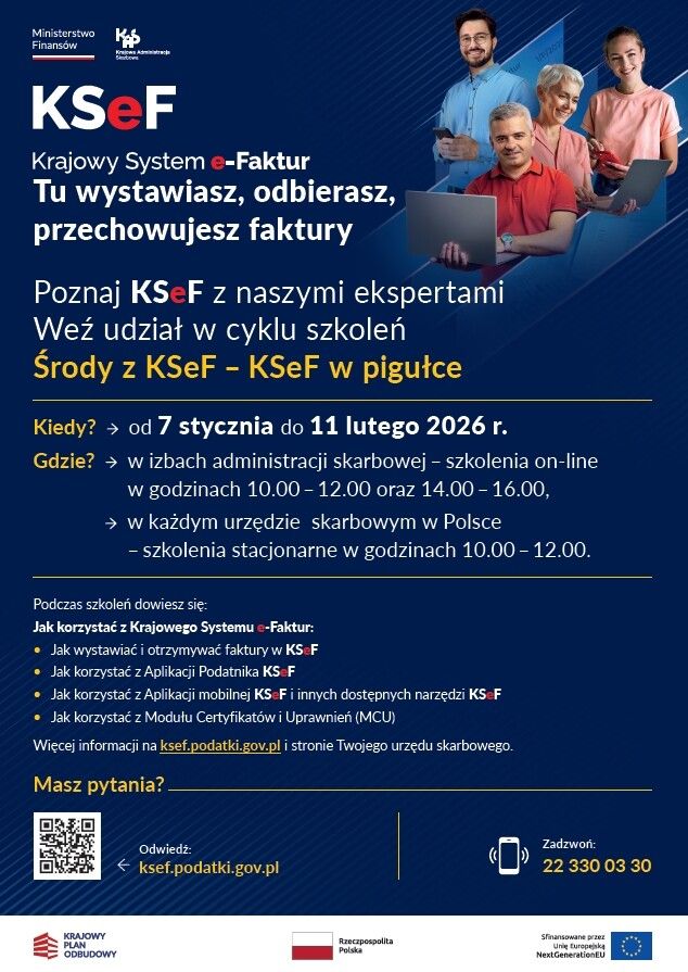 Urząd Skarbowy przypomina także o organizowanych w środy, od 7 stycznia do 11 lutego br., szkoleniach pod nazwą „Środy z KSeF – KseF w pigułce”. Ponadto 24 stycznia br. w chojnickim Urzędzie Skarbowym będzie można wziąć udział w „Dniu otwartym z KSeF” w ramach dodatkowego szkolenia. Szczegóły na plakatach.